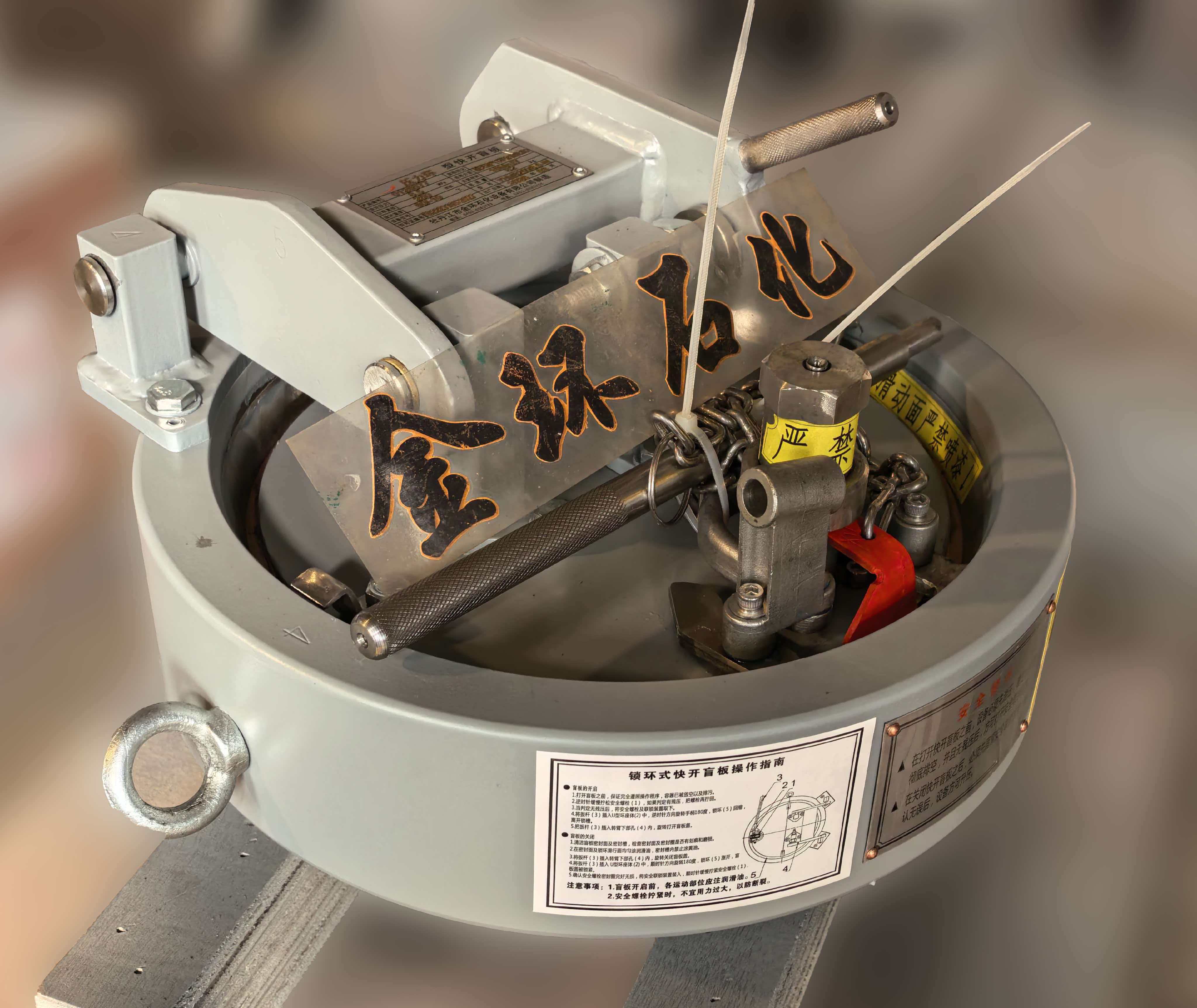 快開盲板是用于壓力管道或壓力容器的圓形開口上的一種機械裝置。一般由筒體法蘭、頭蓋、勾圈或卡箍、密封圈、安全聯(lián)鎖機構(gòu)、開閉機構(gòu)、轉(zhuǎn)臂及短節(jié)(需要時)等部件構(gòu)成。