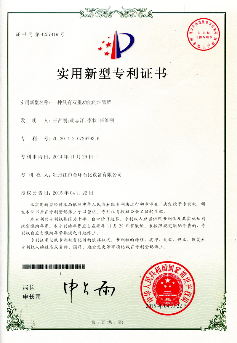 一種具有雙重功能的油管錨實(shí)用新型專(zhuān)利證書(shū)ZL 2014 2 0729793.6